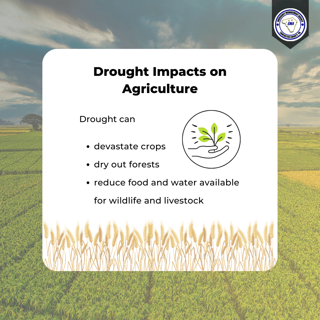 Drought can devastate crops, dry out forests, reduce food and water available for wildlife and livestock. There may be significant direct and indirect economic impacts on the agricultural sector, reducing the water availability and water quality necessary for productive farms, ranches, and grazing lands.