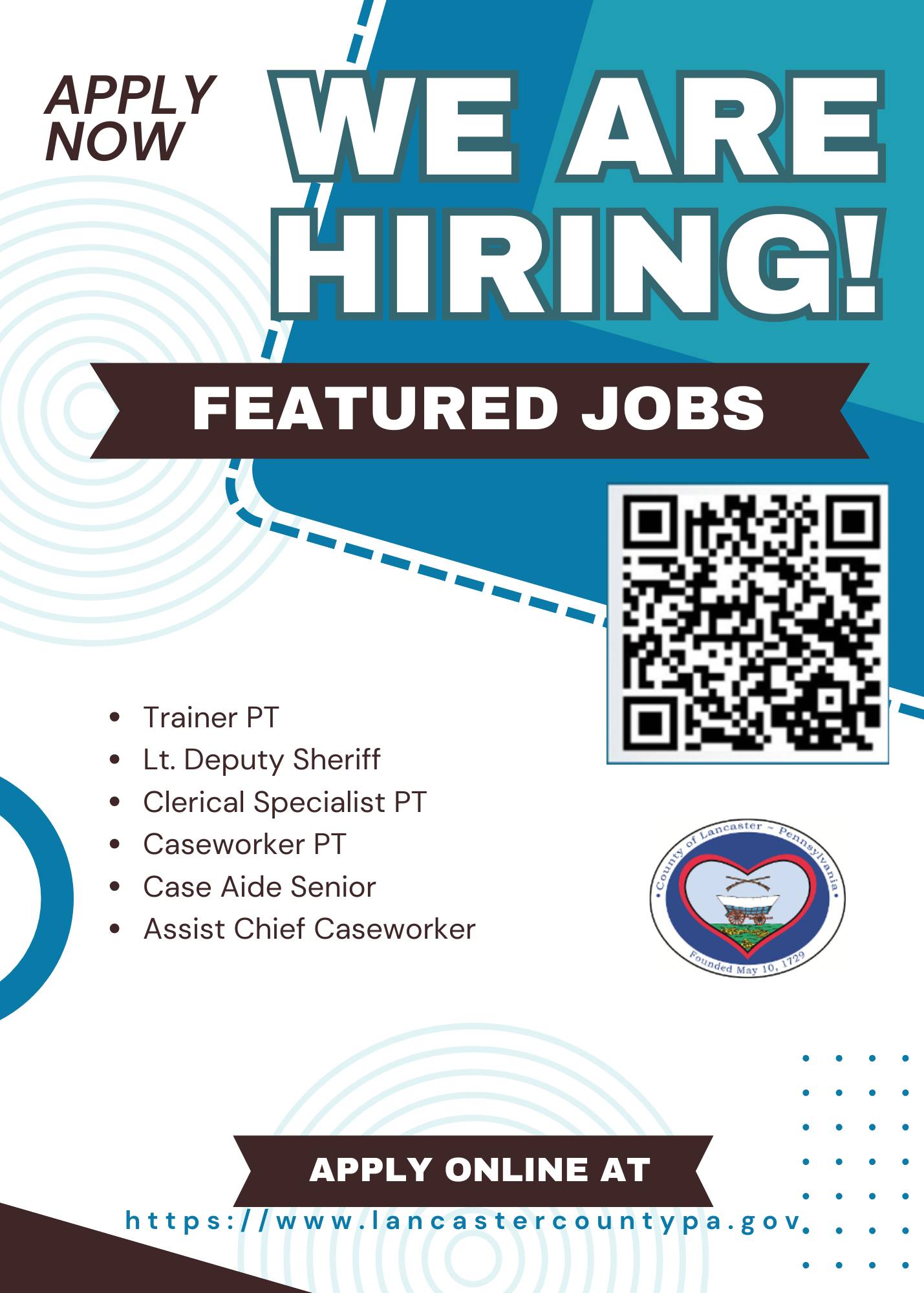 Click here to see  Lancaster County HR's Facebook page of Job Openings/Opportunities that are available.
